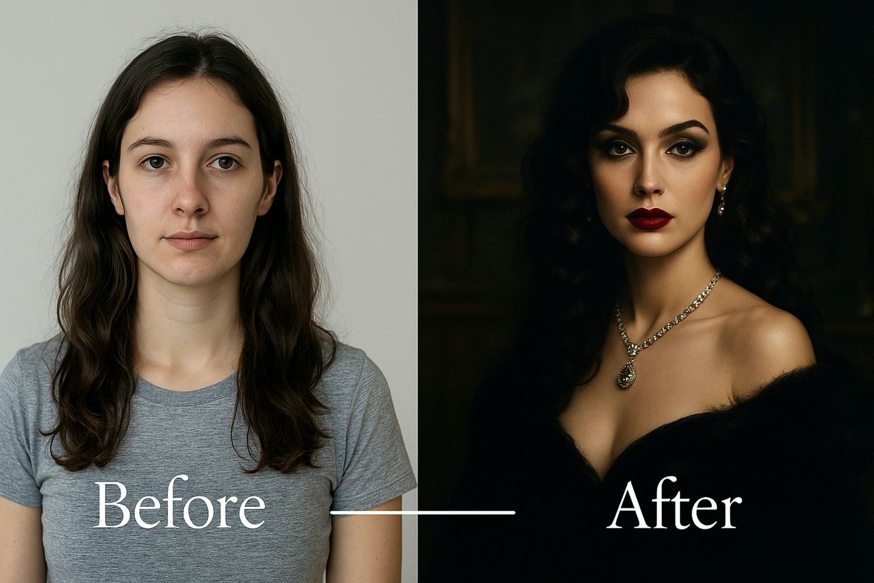 After you purchase, you’ll email me 2–3 clear selfies. I transform them using a blend of AI artistry and professional Barones Lovey De Luxe editing to create a cinematic portrait in one of my signature styles.